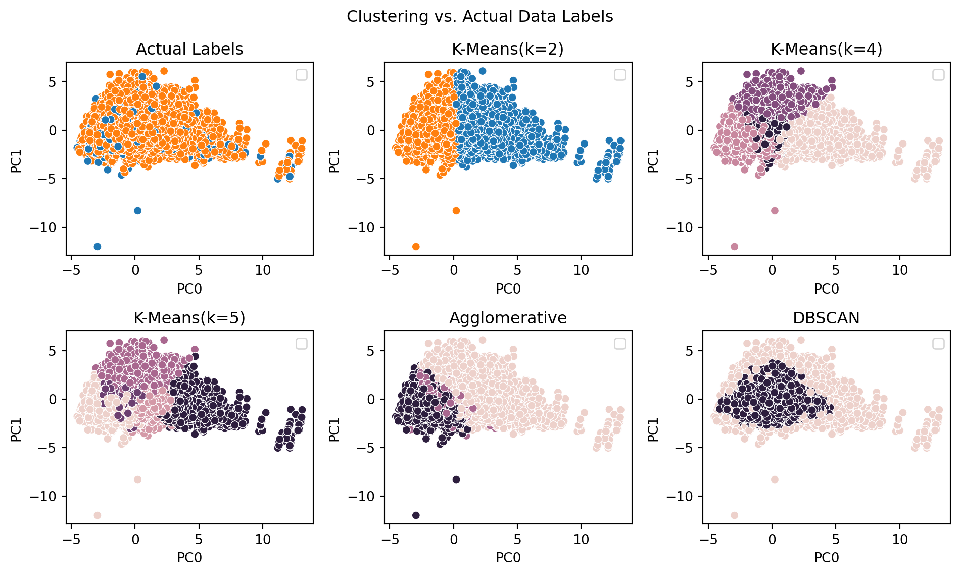 To visualize, one can take the K-Means clusters and apply the same subset of the data as used for Agglomerative and DBSCAN, and also visualize the source data’s labels. This is done in the below figure.