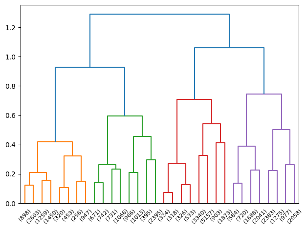 The dendrogram is challenging to interpret in this case, as it’s splitting the data on a roughly PCA-transformed dataset with limited explainability in the data’s variance. Furthermore, the base labels of the dendrogram are simply based upon the datapoints indices themselves, and as such the dendrogram doesn’t add substantial information or interpretability in this context. Performing a plot of the points and their classifications will likely be a more fruitful endeavor.