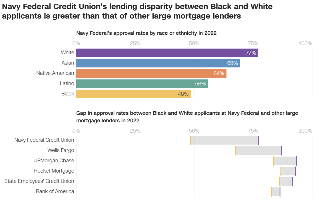 Each of the organizations in the above graphic (from CNN) appear to have some degree of disparity in holding higher approvals for White/Caucasian applicants than for Black/African American, at first glance. The graphic certainly highlights the highest difference in approval rates at NFCU vs that of other financial institutions. Being at the top of the list of disparity absolutely draws ire from onlookers, yet the other institutions on the list may also be worthy of similar scrutiny. Disparate outcomes are disparate outcomes, and any case in which there are significant differences in outcomes for individuals on a basis of age, gender, race, or ethnicity (also called protected classes) is of concern to everyone.