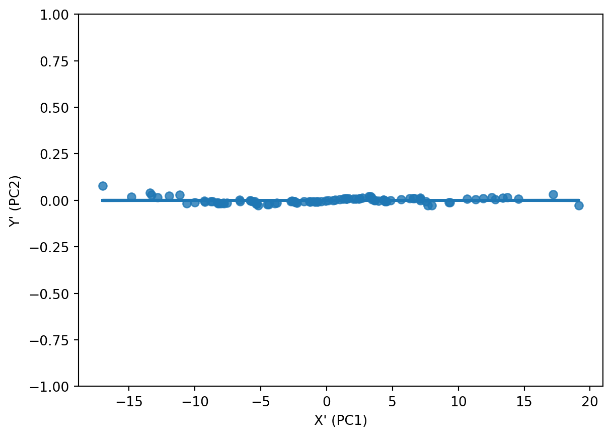 Performing regression analysis on this data once more reveals that the goal of PCA is reached, that the variables, when projected into this new basis, hold no correlation: