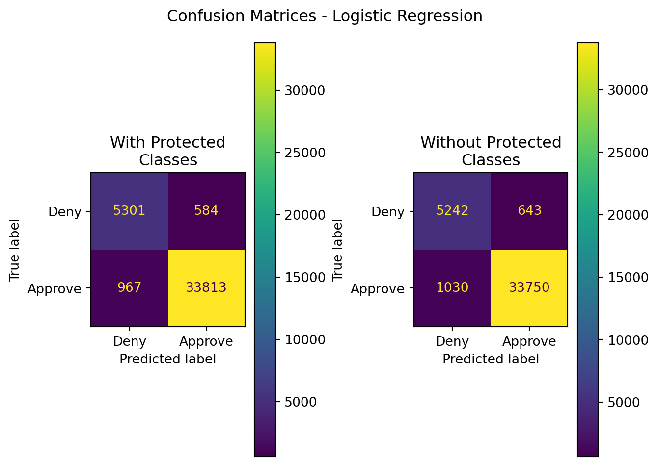 Leveraging that ethical perspective, while the difference is significantly different, from a mathematical standpoint, that models leveraging protected class information outperform those that exclude it, the cost is minimal. Exclustion of protected class information still achieves incredibly high accuracy, precision, Recall, F1, and ROC-AUC, all ranging from 93%-98% to make predictions. Such modeling can be leveraged to inform one as to the likely outcome of the loan application, and can be leveraged in conjunction with other available relevant information to make an informed decision.