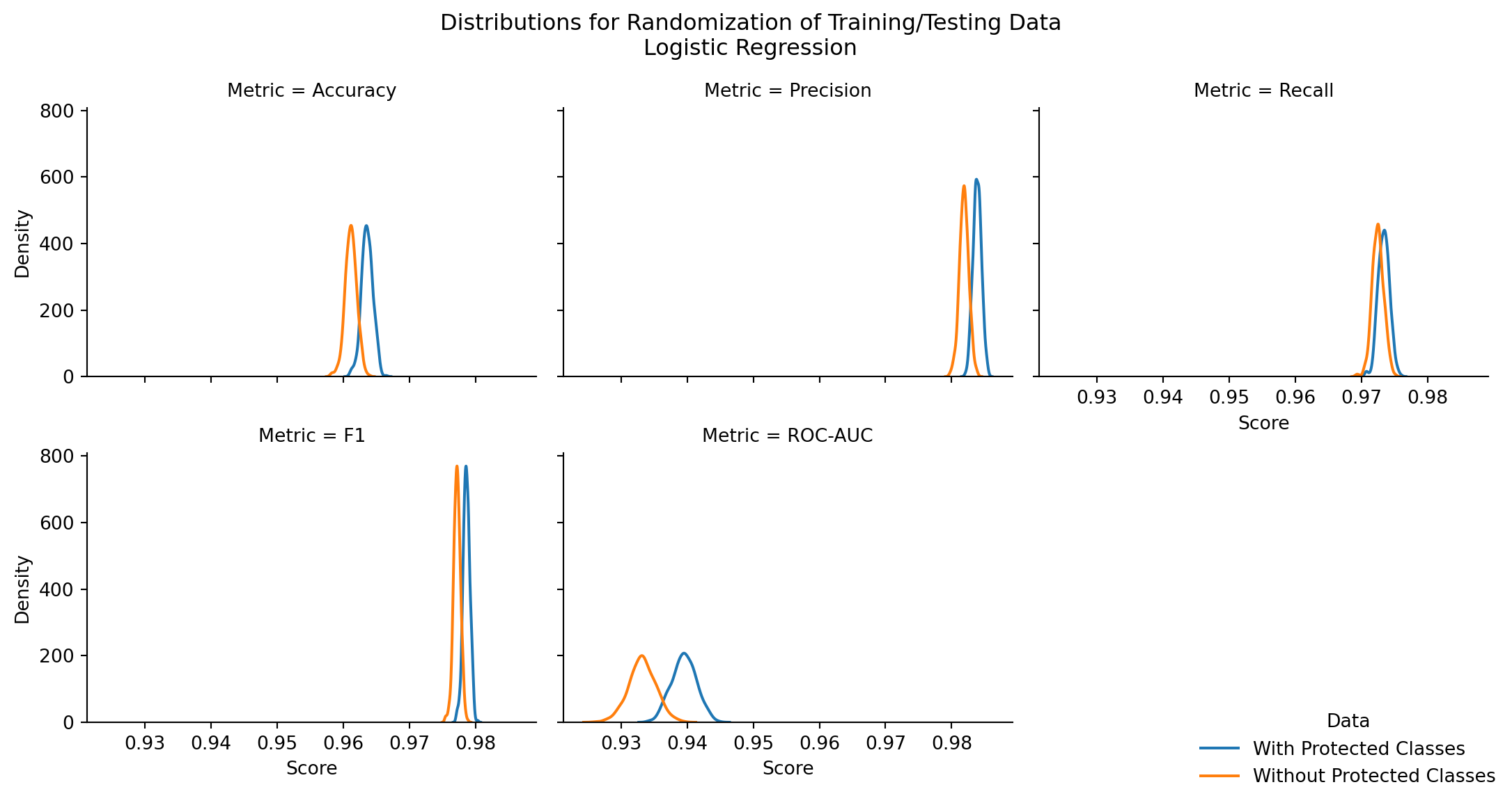 To do so, one can shuffle the data multiple times into new training and testing datasets, re-train the models, and capture the performance scores of each model (one trained with, and one trained without, protected classes). From here, one achieve’s a distribution of the performance scores (such as Accuracy, Precision, Recall, F1, and ROC-AUC scores) of each model; when the number of randomizations increase, the distribution of each should approach a normal distribution.