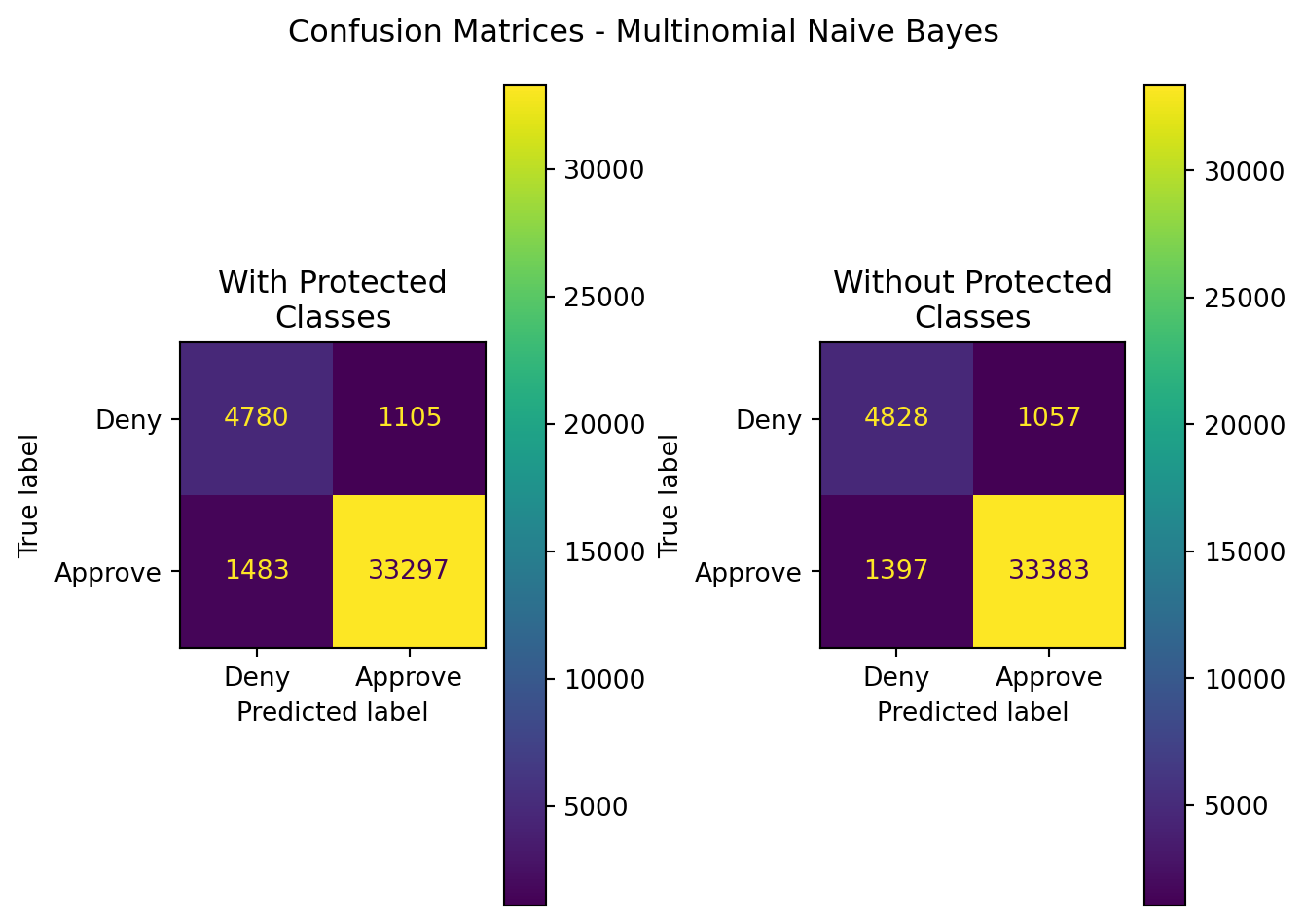 The performance of Logistic Regression, with and without protected classes, far outshined the performance of Multinomial Naive Bayes. Multinomial Naive Bayes may have had better performance had the data provided the opportunity to better be count-vectorized, and as such is better suited for assessing document classification than individual record classification.